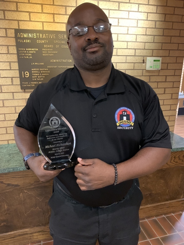 This quarterly Inspiration in Education award was presented to Michael Richardson, security officer at College Station Elementary. The District received a total of 35 nominations for this quarter, with four in support of Officer Richardson.