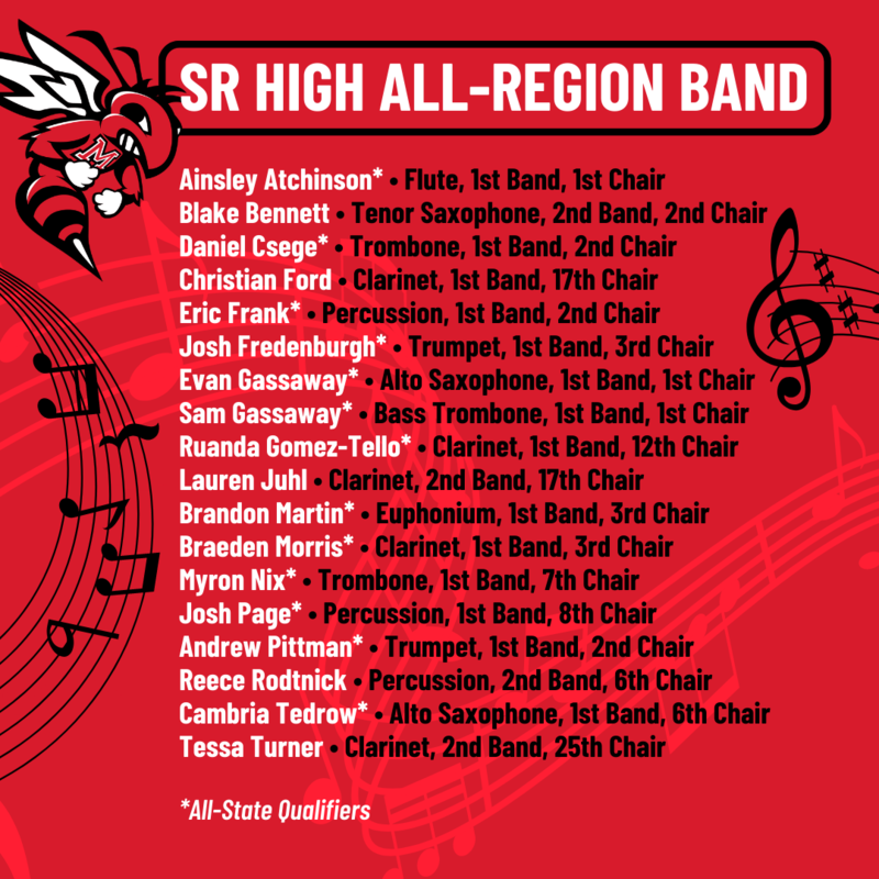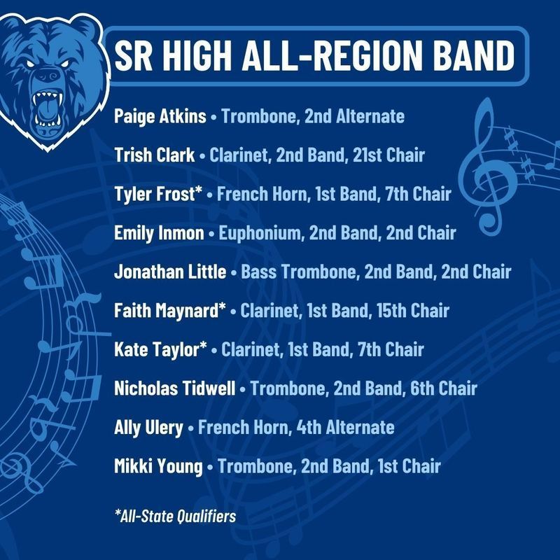 The following students have qualified for All-State: Ainsley Atchinson, Keaton Brasfield, Parker Brasfield, David Clark, Daniel Csege, Eric Frank, Kennedy Fraser, Josh Fredenburgh, Tyler Frost, Evan Gassaway, Sam Gassaway, Ruanda Gomez-Tello, Abigail Henson, Ronan Kordsmeier, Brandon Martin, Faith Maynard, Madelyn McTight, Braeden Morris, Myron Nix, Josh Page, Andrew Pittman, Annabelle Ridlon, Kenzie Stephens, Meredith Stoops, Kate Taylor, and Cambria Tedrow.
