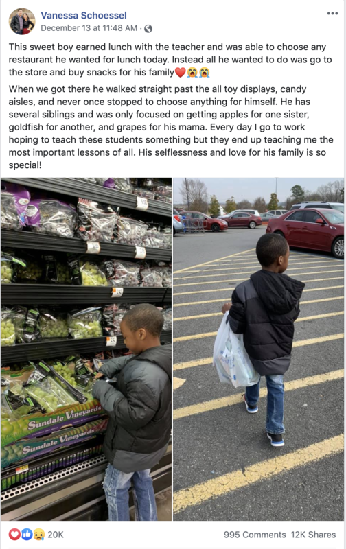 Instead of picking McDonald's, Chick-fil-A or something similar, Samuel wanted to go to Walmart to buy snacks for his family. Mrs. Schoessel was so touched by Samuel's kindness, she shared the story on her Facebook page. Since posting on December 13, the post has been shared more than 12,000 times and has nearly 1,000 comments!